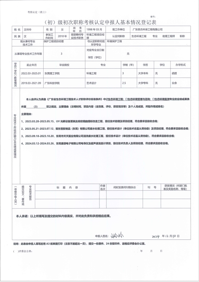 发布时间:2024-12-27 09:45 来源:广东荣杰环保 我单位员工评审助理工程师,现予公示。公示时间2024年12月27日-2025年01月05日。